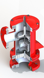 閥盤(pán)質(zhì)量根據(jù)油罐的設(shè)計(jì)允許壓力和閥盤(pán)直徑確定,必要時(shí)可利用配重調(diào)節(jié)。當(dāng)閥盤(pán)自由放在閥座上時(shí),在閥盤(pán)重力作用下,氟膜片微微凹向空氣墊凹槽。當(dāng)罐內(nèi)外壓力差增大時(shí),閥盤(pán)微微升起,膜片靠自身的彈性,同閥座仍保持良好的密封,直至整個(gè)閥盤(pán)跳離閥座,膜片才經(jīng)反彈逐漸恢復(fù)其原狀。
